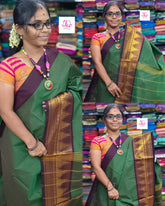 This saree comes with beautiful Kanchipuram-style gold/copper zari woven borders. The body is woven plain, stripes & Pallu has simple and elegant stripes. These sarees are a fusion of Chettinad Cottons sarees with Kanchivaram-style copper/gold zari woven borders.