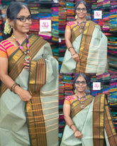 This saree comes with beautiful Kanchipuram-style gold/copper zari woven borders. The body is woven plain, stripes & Pallu has simple and elegant stripes. These sarees are a fusion of Chettinad Cottons sarees with Kanchivaram-style copper/gold zari woven borders.