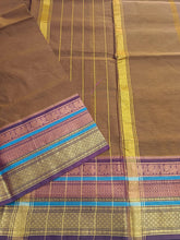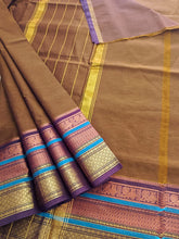 This saree comes with beautiful Kanchipuram-style gold/copper zari woven borders. The body is woven plain, stripes & Pallu has simple and elegant stripes. These sarees are a fusion of Chettinad Cottons sarees with Kanchivaram-style copper/gold zari woven borders.