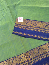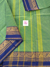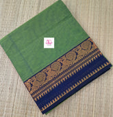 This saree comes with beautiful Kanchipuram-style gold/copper zari woven borders. The body is woven plain, stripes & Pallu has simple and elegant stripes. These sarees are a fusion of Chettinad Cottons sarees with Kanchivaram-style copper/gold zari woven borders.