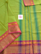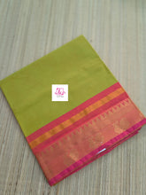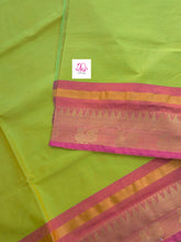This saree comes with beautiful Kanchipuram-style gold/copper zari woven borders. The body is woven plain, stripes & Pallu has simple and elegant stripes. These sarees are a fusion of Chettinad Cottons sarees with Kanchivaram-style copper/gold zari woven borders.