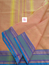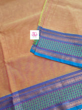 This saree comes with beautiful Kanchipuram-style gold/copper zari woven borders. The body is woven plain, stripes & Pallu has simple and elegant stripes. These sarees are a fusion of Chettinad Cottons sarees with Kanchivaram-style copper/gold zari woven borders.