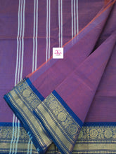 This saree comes with beautiful Kanchipuram-style gold/copper zari woven borders. The body is woven plain, stripes & Pallu has simple and elegant stripes. These sarees are a fusion of Chettinad Cottons sarees with Kanchivaram-style copper/gold zari woven borders.