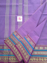 This saree comes with beautiful Kanchipuram-style gold/copper zari woven borders. The body is woven plain, stripes & Pallu has simple and elegant stripes. These sarees are a fusion of Chettinad Cottons sarees with Kanchivaram-style copper/gold zari woven borders.