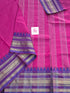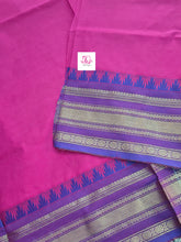 This saree comes with beautiful Kanchipuram-style gold/copper zari woven borders. The body is woven plain, stripes & Pallu has simple and elegant stripes. These sarees are a fusion of Chettinad Cottons sarees with Kanchivaram-style copper/gold zari woven borders.