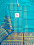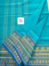 This saree comes with beautiful Kanchipuram-style gold/copper zari woven borders. The body is woven plain, stripes & Pallu has simple and elegant stripes. These sarees are a fusion of Chettinad Cottons sarees with Kanchivaram-style copper/gold zari woven borders.