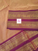This saree comes with beautiful Kanchipuram-style gold/copper zari woven borders. The body is woven plain, stripes & Pallu has simple and elegant stripes. These sarees are a fusion of Chettinad Cottons sarees with Kanchivaram-style copper/gold zari woven borders.