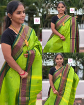 This saree comes with beautiful Kanchipuram style gold/copper zari woven borders on Kanchi cotton with body woven butta. Pallu has simple and elegant stripes with butta. These sarees are a fusion of Chettinad Cottons sarees with Kanchivaram-style copper/gold zari woven borders.