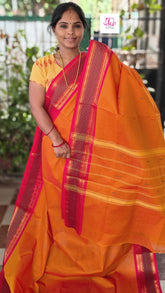 This saree comes with beautiful Kanchipuram style gold/copper zari woven borders on Kanchi cotton with body woven butta. Pallu has simple and elegant stripes with butta. These sarees are a fusion of Chettinad Cottons sarees with Kanchivaram-style copper/gold zari woven borders.