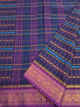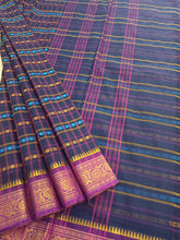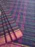 This saree comes with beautiful Kanchipuram style gold/copper zari woven borders on Kanchi cotton with body woven butta. Pallu has simple and elegant stripes with butta. These sarees are a fusion of Chettinad Cottons sarees with Kanchivaram-style copper/gold zari woven borders.