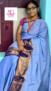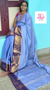 This saree comes with beautiful Kanchipuram style gold/copper zari woven borders on Kanchi cotton and Plain body . Pallu has simple and elegant stripes . These sarees are a fusion of Chettinad Cottons sarees with Kanchivaram-style copper/gold zari woven borders.
