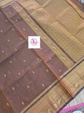 This saree comes with beautiful Kanchipuram style gold/copper zari woven borders with attractive grand . Pallu . These sarees are a fusion of Chettinad Cottons sarees with Kanchivaram-style copper/gold zari woven borders.