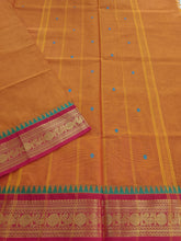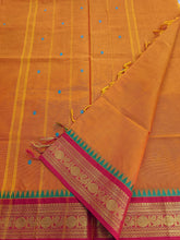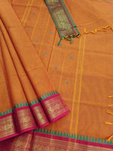 This saree comes with beautiful Kanchipuram style gold/copper zari woven borders on Kanchi cotton with body woven butta. Pallu has simple and elegant stripes with butta. These sarees are a fusion of Chettinad Cottons sarees with Kanchivaram-style copper/gold zari woven borders.