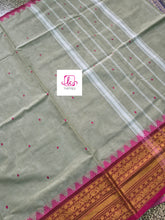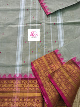 This saree comes with beautiful Kanchipuram style gold/copper zari woven borders on Kanchi cotton with body woven butta. Pallu has simple and elegant stripes with butta. These sarees are a fusion of Chettinad Cottons sarees with Kanchivaram-style copper/gold zari woven borders.