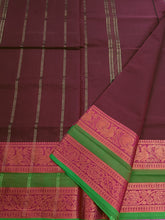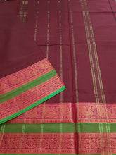This saree comes with beautiful Kanchipuram style gold/copper zari woven borders on Kanchi cotton and Plain body . Pallu has simple and elegant stripes . These sarees are a fusion of Chettinad Cottons sarees with Kanchivaram-style copper/gold zari woven borders.