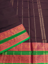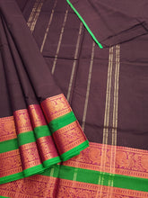 This saree comes with beautiful Kanchipuram style gold/copper zari woven borders on Kanchi cotton and Plain body . Pallu has simple and elegant stripes . These sarees are a fusion of Chettinad Cottons sarees with Kanchivaram-style copper/gold zari woven borders.