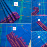 This saree comes with beautiful Kanchipuram style gold/copper zari woven borders on Kanchi cotton with all over body veldhari designs. Pallu has simple and elegant stripes . These sarees are a fusion of Chettinad Cottons sarees with Kanchivaram-style copper/gold zari woven borders.