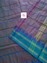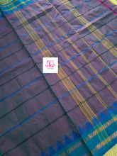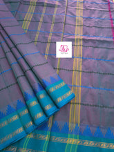 This saree comes with beautiful Kanchipuram style gold/copper zari woven borders on Kanchi cotton with all over body veldhari designs. Pallu has simple and elegant stripes . These sarees are a fusion of Chettinad Cottons sarees with Kanchivaram-style copper/gold zari woven borders.