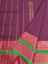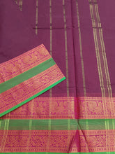This saree comes with beautiful Kanchipuram style gold/copper zari woven borders on Kanchi cotton and Plain body . Pallu has simple and elegant stripes . These sarees are a fusion of Chettinad Cottons sarees with Kanchivaram-style copper/gold zari woven borders.