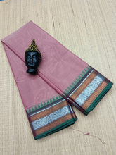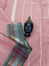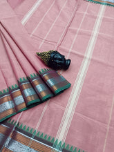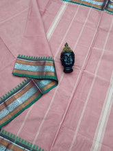 This saree comes with beautiful Kanchipuram style gold/copper zari woven borders on Kanchi cotton and Plain body . Pallu has simple and elegant stripes . These sarees are a fusion of Chettinad Cottons sarees with Kanchivaram-style copper/gold zari woven borders.