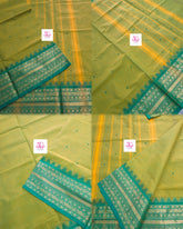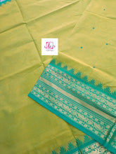 This saree comes with beautiful Kanchipuram style gold/copper zari woven borders on Kanchi cotton with body woven butta. Pallu has simple and elegant stripes with butta. These sarees are a fusion of Chettinad Cottons sarees with Kanchivaram-style copper/gold zari woven borders.